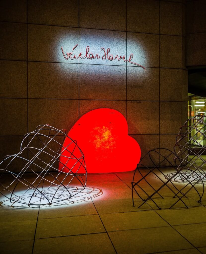 L’ancien dissident et président Václav Havel signait toujours ses courriers d’un coeur rouge. Un personnage d’une grande bonté (très proche du dalaï-lama) et qui s’est « désisté » pour le Nobel de la Paix (au début des années 1990, alors président de la Tchécoslovaquie et favori pour le prix, Havel a activement soutenu la candidature de la dissidente birmane Aung San Suu Kyi, estimant qu’elle en avait besoin pour sa protection et que le prix Nobel de la paix devait récompenser des citoyens agissant pour les droits humains et non des chefs d’Etat). Si l’aéroport porte son nom (petit mémorial au terminal 2), Václav Havel détestait l’avion. Comme il était homme de théâtre, il était plus opportun de lui rendre hommage entre le Théâtre national et son annexe brutaliste (observez les rectangles de verre de ce dernier bâtiment, derrière, ce sont des tubes cathodiques ! Surprenant non ?) Un grand coeur rouge s’y trouve désormais et s’illumine le soir venu. En entrant sur l’île de Kampa via le le pont de la Légion (Most Legií), vous trouverez également une oeuvre au pochoir récemment restaurée…